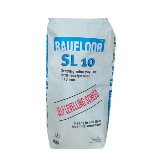 Temiz bir karıştırma kabına önce 6 – 6,5 litre su konulmalı, daha sonra bir taraftan karıştırma yapılırken diğer taraftan 25 kg SL 10 yavaşça eklenmeli ve topaklanma engellenecek şekilde, hava kaparcıkları tamamen kayboluncaya kadar karıştırılmalıdır. Karıştırıcı olarak uygun bir karıştırıcı kullanılmalıdır. (max. 600 devir/dakika elektirikli matkap ve spiral uç). Karışım 1 dakika dinlendirildikten sonra, kısa bir süre daha karıştırılmalı ve önceden hazırlanmış yüzeye, uygun bir mala ile istenilen kalınlıkta yayılmalıdır. Priz süresince su eklenmemeli ve yüzeydeki hava kabarcıkları, kirpi rulo ile giderilmelidir. Baufloor SL10, +5°C’nin altındaki sıcaklıklarda uygulanmamalı ve ani sıcaklık değişiklikleri engellenmeli ve hava cereyanlarından korunmalıdır. Zeminden ısıtmalı sistemlerde ısıtma 10 gün önceden devreye girmiş olmalı ve uygulama esnasında kapatılmalıdır.Uygulamadan 72 saat sonra sistem tekrar çalıştırılabilir.